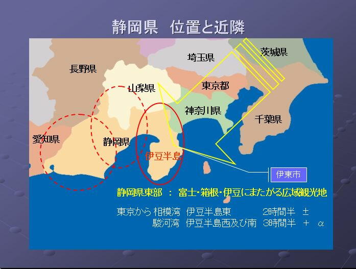 静岡県東部地域伊豆半島は大都市圏を有する関東地方に隣接し、東京から2〜3時間前後の距離にあり、富士、