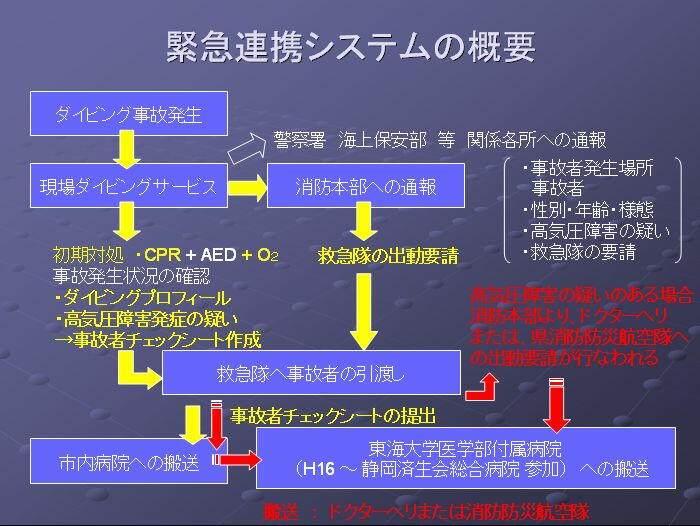 用する事とされている。しかし全国的に「減圧障害」に対処する組織的な連絡網や搬送と治療等の連携は構築されて
