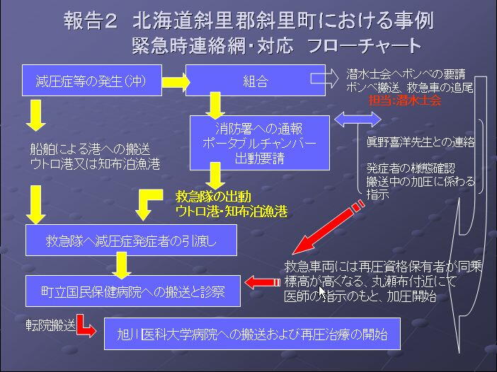めの「緊急連携システム」と、北海道斜里郡斜里町における漁業者の減圧症等発症者への自助対策について報告し、