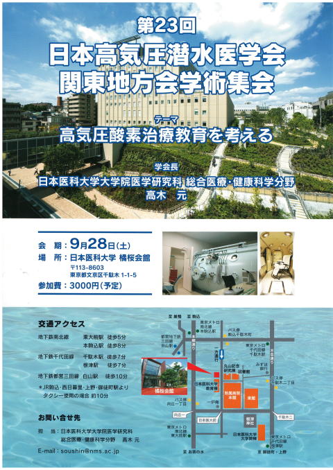 第59回 日本高気圧潜水医学会 学術総会 終了いたしました。 会期 2025年 6月27日(金)~28日(土) 会場 すみだ保険子育て総合センター (東京都墨田区) 会長 三浦 邦久 医療法人伯鳳会 東京曳舟病院副院長 テーマ 連携 詳細については「第59回日本高気圧酸素潜水医学会学術集会」ホームページ にてご確認ください。 検索ワード : 第59回日本高気圧酸素潜水医学会学術集会 第23回潜水医学講座「小田原セミナー」 終了いたしました。 テーマ 「危険を知って安全に潜ろう」 日 時 2025年 2月 1日 (土) 11:30 受付開始 場 所 小田原三の丸ホール 小ホール 神奈川県小田原市本町1丁目7-50 駐車場はありませんので、周囲の有料駐車場をご利用ください。 開 催 者 (特非)潜水医学情報ネットワーク (一社)日本高気圧潜水医学会 関東地方会 対 象 者 警察・消防・海保・自衛隊等 救急機関関係者、 医師・看護師等医療機関関係者 ダイビングインストラクターから一般ダイバー、潜水士等 聴 講 料 お一人 2,000円 (抄録集代金含む) プログラム 演題 1. ダイバーと溺死 順天堂大学名誉教授 河合 祥雄 演題 2. 減圧障害などの潜水障害を避けるために 亀田総合病院救命救急科 鈴木 信哉 演題 3. ダイブコンピュータを賢く使う GF等の設定 SDI・TDI・ERDI JAPAN 加藤 大典 演題 4. 「酸素講習」の紹介 (一財)日本海洋レジャー・安全振興協会 安全事業部長 高野 修 参加方法 開催当日、三の丸ホールへお越しください。 参加証明書が必要な方は、受付へ御申しつけ下さい。 第23回 日本高気圧潜水医学会 関東地方会 学術集会 終了いたしました。 ![]() 【第23回日本高気圧潜水医学会 関東地方会学術集会 海洋医療初期対応研修の開催】 海洋での活動中に起こる事故やケガ(減圧症や海洋咬刺症など)は救急疾患ですが、 一般の医師や看護師のみならず、救急医療従事者でさえも応急処置や治療法に詳しく ないのが現状です。このため、医療従事者、警察・消防・海上保安庁・自衛隊などの 救急関係者、漁協関係者、ダイビングインストラクターなどのレジャー・観光事業関係者に 対して、海洋医療の普及・啓発が重要と考えます。 昨年の学術集会に引き続き、第23回日本高気圧潜水医学会 関東地方会学術集会では、 以下の通りICMM(Immediate Care of Marine Medicine)を開催いたします。 1.日時: 2024年9月28日(土) 9:30~12:30 2.場所: 日本医科大学 橘桜会館(文京区千駄木1-1-5) 3.開催者:学会長 髙木元(日本医科大学大学院医学研究科総合医療・健康科学分野) 4.対象者:医療従事者(医師・看護師・コメディカルなど)、 警察・消防・海上保安庁・自衛隊などの救急関係者、漁業関係者、 ダイビングインストラクターなど観光事業関係者 5.募集人数: 50名 6.参加費: 5,000円(テキスト代含む) 7.研修内容: (1)潜水医学の基礎知識 (2)潜水と救急疾患 (3)潜水適性に関する問題 (4)海洋咬刺症 (5)海洋細菌と創部感染 (6)BLS(一次救命処置)とAEDの使用 8.申込先:E-mail: soushin@nms.ac.jp (件名に「ICMM申し込み」と記載し、受講者の所属、氏名、職種、メールアドレス、 修了証の送付先を明記してください) 9.その他:この研修は新バージョンで開催いたします。研修修了者には修了証を 発行いたします。 ![]() 「第58回日本高気圧潜水医学会学術総会」 終了いたしました。 「東京医科歯科大学病院 高気圧治療部 国際セミナー」 終了致しました。 第58回日本高気圧潜水医学会 学術総会 が下記要綱で開催されます。 ご都合のつく方は、ご参加いただければ幸いです。 拡散希望 第58回日本高気圧潜水医学会 学術総会 会 期 2024年 6月28日(金)・29日(土) 会 長 川嶌眞之 社会医療法人玄真堂 川嶌整形外科病院 院長 会 場 ヴィラルーチェ 〒871-0058 大分県中津市東本町1 TEL 0979-23-1122 テーマ 雲外蒼天 参加費等については、下記ホームページでご確認ください。 学術総会ホームページ https://kawashimahp.jp/juhms58/ 東京医科歯科大学病院 高気圧治療部主催で、 「国際セミナー」が下記要綱にて開催されます。 東京医科左飛科大学病院 高気圧治療部 「国際セミナー」 日 時 2024年 6月25日(火) 会 場 東京医科歯科大学 M&Dタワー2階 教養講義室1 講 師 Michael B Strauss 先生 演 題 1. Traumatic Ischemias and the Roles of Hyperbaric Oxygen. -Focusing on Crush Injuries- 2.A Physiological Model for DCS Presentations. 講 師 小栁津 卓哉 先生 演 題 The mechanisms of hyperbaric oxygen treatment for skeletal muscle injuries. 第22回 潜水医学講座 小田原セミナー 会期 2024年 2月 3日 土曜日 会場 東京海洋大学品川キャンパス 楽水会館 終了いたしました。 第22回 日本高気圧環境・潜水医学会 関東地方学術集会 開催のお知らせ 会 期 2023年 7月 1日 場 所 すみだ産業会館 東京都墨田区江東橋3丁目9番10号 墨田区・丸井共同開発ビル8・9階 開 会 13:00 開場・受付 12:00より 参加費 3000円を予定 午前中に次の2件が開催予定です。 1. ICMM Immediate Care Marine Medicine 海洋医療即時対応コース 「潜水学の基礎知識」 「潜水と救急疾患」 「潜水適正に関する問題」 「海洋咬刺症」 「海洋細菌と創部感染」 「BLSとADE」 が学べます。 参加対象者に