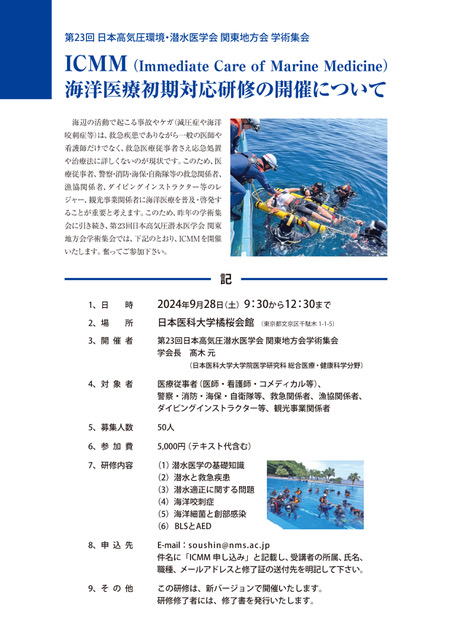 海辺の活動で起こる事故やケガ(減圧症や海洋咬刺症等)は、救急疾患でありながら一般の医師や看護師だけでなく、救急医療従事者さえ応急処置や治療法に詳しくないのが現状です。このため、医療従事者、警察・消防・海保・自衛隊等の救急関係者、漁協関係者、ダイビングインストラクター等のレジャー、観光事業関係者に海洋医療を普及・啓発することが重要と考えます。このため、昨年の学術集会に引き続き、第24回日本高気圧潜水医学会関東地方会学術集会では、ICMMを開催いたします。